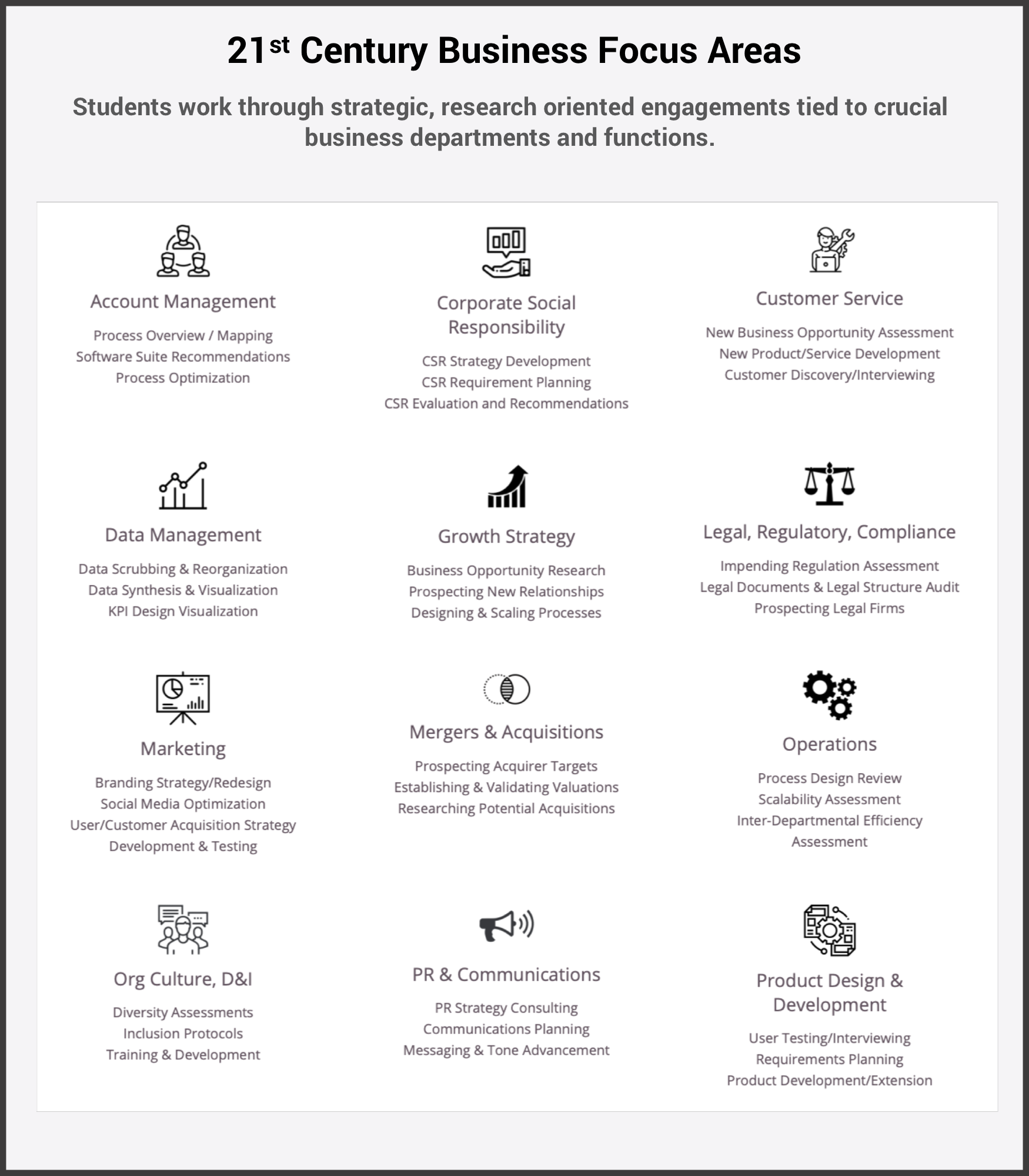 Learn more about the functional business areas we can incorporate into your custom cross-functional experiential learning engagement.